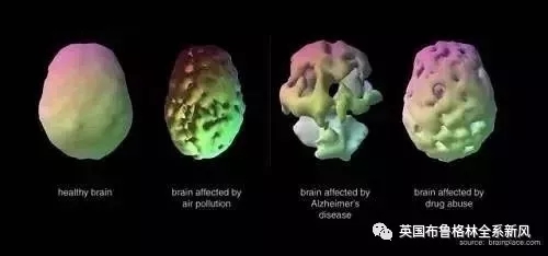 左起圖一為健康大腦,圖二、三、四依次為被空氣污染、老年癡呆癥以及毒品侵蝕的大腦