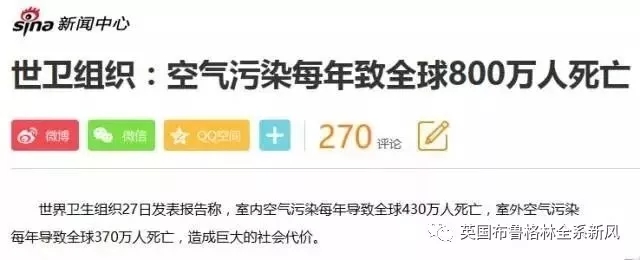 世界衛(wèi)生組織2015年公告也顯示,全世界每年有800萬人死于空氣污染。