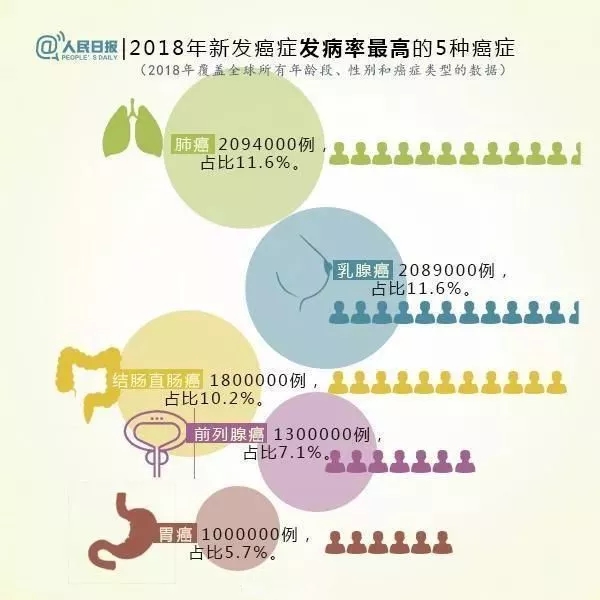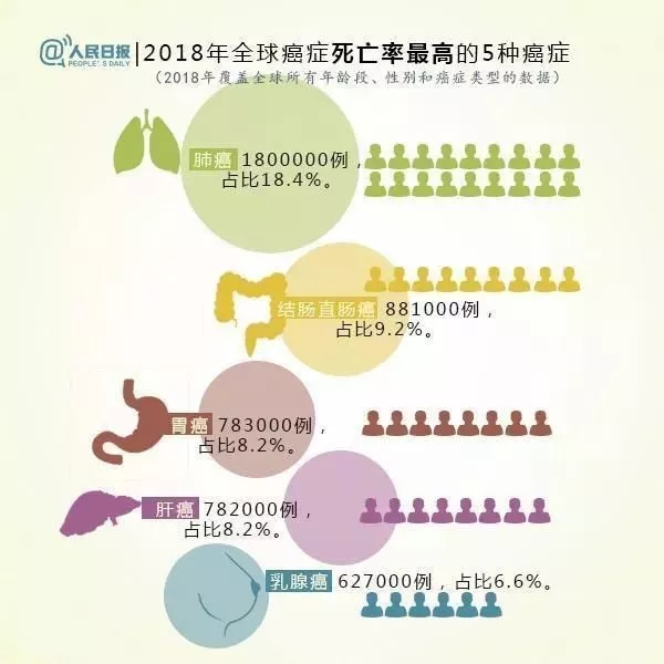 肺癌(18.4%)、結(jié)腸直腸癌(9.2%)、胃癌(8.2%)、肝癌(8.2%)、乳腺癌(6.6%)